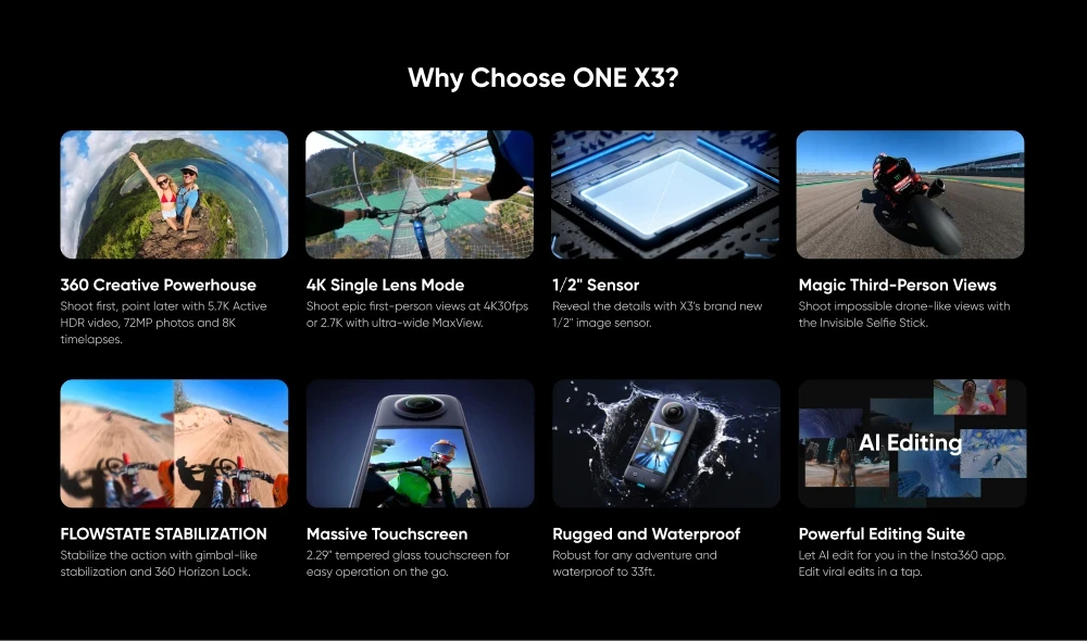 Original Insta360 X3 - Waterproof 360 Action Camera with 1/2" 48MP Sensors,5.7K 360 Active HDR Video,72MP Photo,4K Single-Lens